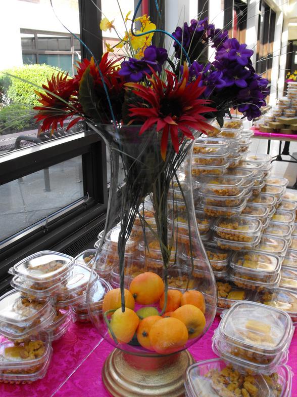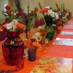 During intermission, the snack area was set up in the commons. The snack containers were tiered, a large vase with faux flowers added decor and the table covering added a punch of bold color. ~