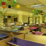 The mission for this function was to transform a dull, colorless, sterile high school cafeteria into a dining area for 350 guests to enjoy. Cut branches and paper lanterns dangled from the ceiling, fresh bamboo stood within the table groupings, embossed metallic foils were used as table coverings and 70 centerpieces decorated the tables. ~