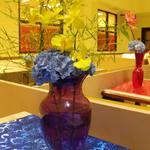 Each of the 70 centerpieces were unique and different. Colored glass vases were used, topped with a fresh hydrangea flower. A faux (silk) orchid stem added height, drama and contrasting color to complete the creation. (Orchids and colored vases available as a rental for your function. ~